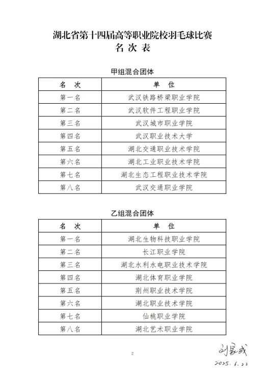 (通讯员:陈玥)湖北省第十四届高等职业院校教职工羽毛球比赛在6月19日至6月22日举行,武汉铁路桥梁职业学院教职工代表队获得甲组混合团体冠军。