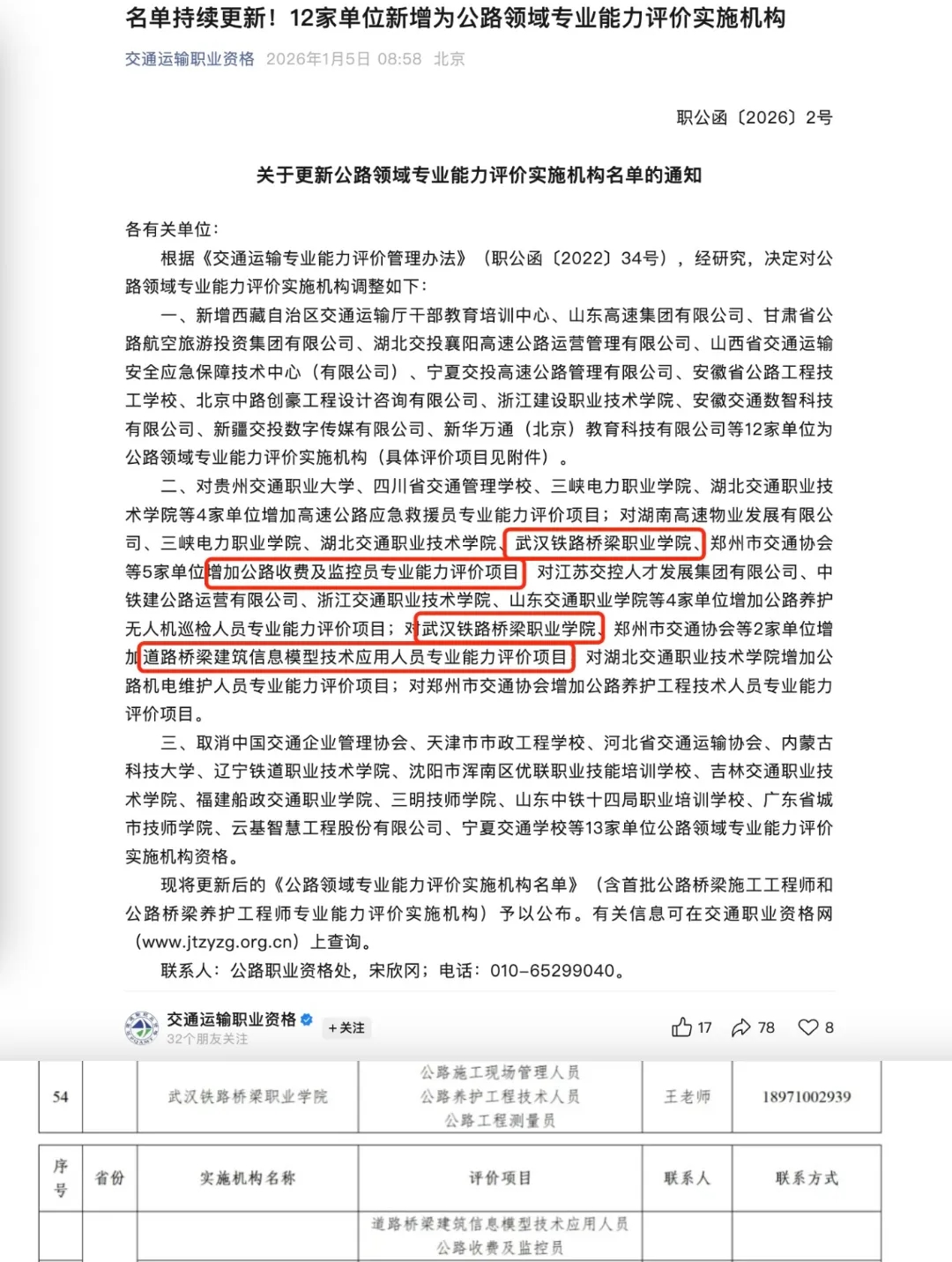 (通讯员:潘以明、白玉平)近日,从交通运输部职业资格中心传来喜讯!根据《关于更新公路领域专业能力评价实施机构名单的通知》(职公函〔2026〕2号)文件公布结果,学校主动申报的道路桥梁建筑信息模型技术应用人员、公路收费及监控员两个专业能力评价项目,经严格筛选评估成功获批实施机构资格。