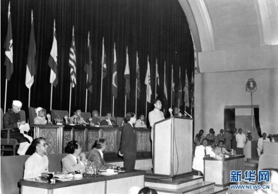 1955年4月,周恩来再次率团参加在印度尼西亚万隆召开的亚非会议。这是周恩来在万隆会议上发言。 新华社发