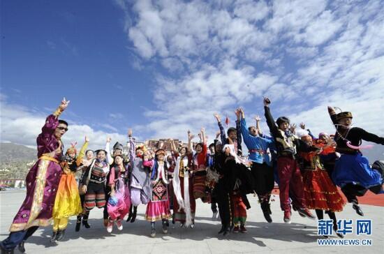 参加“民族情 雪域行”活动的民族团结形象代表在西藏拉萨布达拉宫广场合影(2012年9月27日摄)。新华社记者 觉果 摄