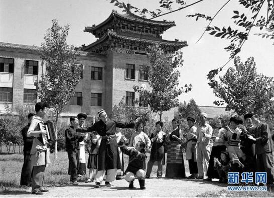 在北京中央民族学院(现为中央民族大学)学习的少数民族学生在校园内欢舞(资料照片)。新华社记者 傅军 摄