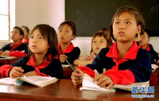 苦聪姐妹张民勒(前右,时年10岁)和张民松(前左,时年8岁)和同学们在云南省者米乡下纳咪小学内上课(资料照片)。新华社记者 蔺以光 摄