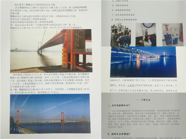 11月25日由材料工程系曹建生、蔡湘琪、班主任朱芳一和王怡琼带队参观了鹦鹉洲长江大桥和桥梁文化主题公园,系主任曹建生老师对桥梁建筑历史和桥梁建筑材料发展作了全面的介绍,接着由带队蔡湘琪老师对鹦鹉洲长江大桥桥梁结构、材料、施工工艺和材料检测在桥梁建设中的运用进行形象、直观的讲解。