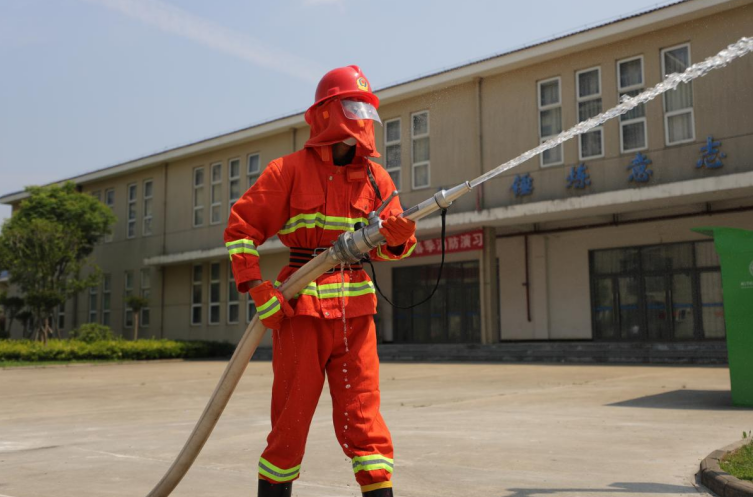 油盆灭火结束后,还进行了学生义务消防队员用消火栓灭火演练。学院消防站接到“火灾报警”后,四名学生义务消防员立即穿戴消防服,携消防器材(三具消防水带及消防枪头)奔赴“火灾现场”,到达“火灾现场”时三人铺设水带并连接消防枪头,一人打开消防栓并连接水带。准备工作完成后打开消防栓水闸进行灭火作业。在四名“消防员”的熟练配合下,成功解除“火灾险情”。