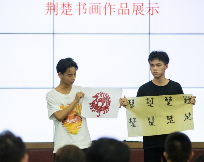 周新城同学(左)展示“火凤凰”,张远霖同学(右)展示书法“楚”字