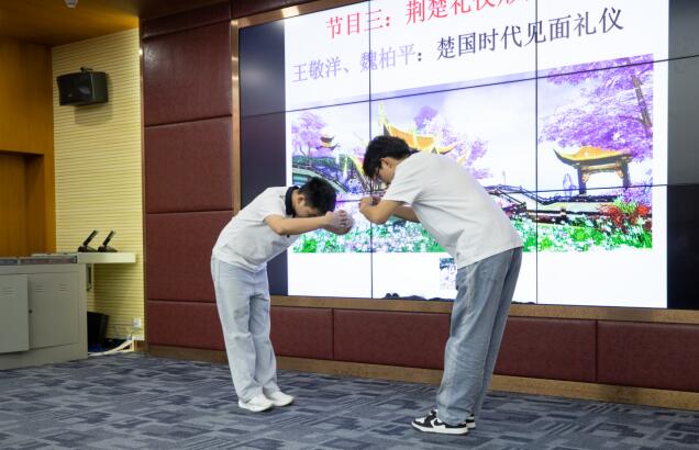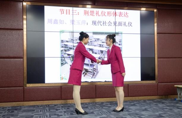 礼仪展示环节,优雅且惊艳。周鑫如、梁玉萍两位女生为观众示范了现代社会的见面礼仪,王敬洋、魏柏平两位男生则示范了楚国时代的见面礼仪。站要笔直,坐要端正,行要稳健,待人接物要彬彬有礼。两位女生,气质如兰,举止优雅,让人惊艳无比;两位男生,风度翩翩,举手投足,尽显绅士风范。