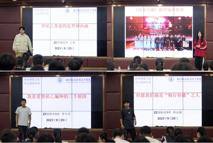 演讲比赛环节,理性有激情。金伟同学讲《曾侯乙尊盘的造型和内涵》,从尊到盘,从外在到内在,娓娓道来,鞭辟入里。李星同学讲《用心聆听历史的声音》,用故事+案例的形式,讲述编钟的三大特点——音域宽、音调准、音色美,条理清晰,引人入胜。曾令杰同学讲《我喜爱曾侯乙编钟的三个原因》,分析透彻,言之成理。周永康同学讲《但愿我们都是“精行俭德”之人》,引经据典,发人深省。四位学生,各抒己见,各有所长,做到了激情与理性交融,知识共情感齐飞。