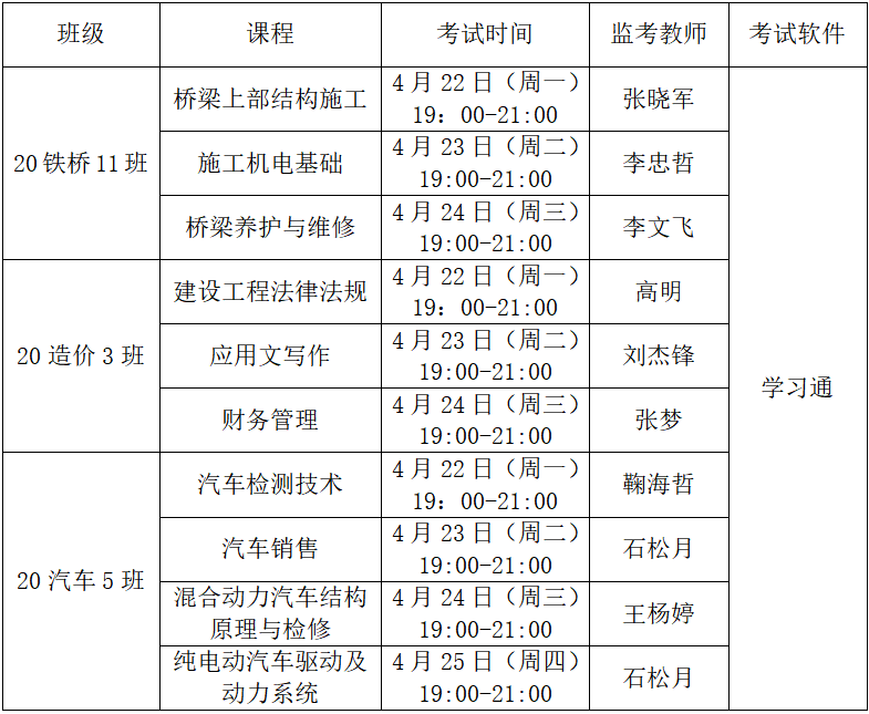 根据本学期教学工作安排,学校将组织20铁桥11班、20造价3班、20汽车5班的学生开展本学期期末考试工作,现将具体考试安排通知如下: