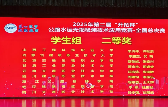 (通讯员:曹建生、郑奕卓)10月15日,2025年第二届“升拓杯”公路水运无损检测技术应用竞赛全国总决赛在甘肃兰州圆满收官。学校教师蔡湘琪、郑奕卓指导的学生李婷、徐世祯凭借扎实的专业功底与出色的实战能力,成功斩获团体二等奖。