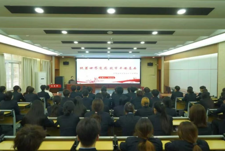 程乐乐从当前国际形势切入,通过详实数据和案例,深入分析了世界格局变化与安全挑战。他强调,建设高水平的平安中国具有重大战略意义,不仅事关民族复兴,更关乎每个人的美好生活和国家的长治久安。随后,他从加强党的领导、贯彻总体国家安全观、防范化解风险等多个维度,系统阐述了平安中国建设的实践路径,带大家回顾了国家安全体系的建设成就。最后,他勉励同学们要珍惜学习时光,掌握扎实的专业技能,树立国家安全意识,培养严谨作风,将维护国家安全的要求内化于心、外化于行,为建设更高水平平安中国贡献自己的力量。