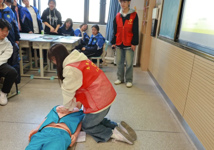 为增强应急自救与互救能力,普及心肺复苏急救知识,学校红十字会志愿者联合社区志愿服务团队走进育才中学,为九年级11班、12班的同学们开展了一场生动实用的心肺复苏科普课堂。学校红十字会志愿者现场进行实操示范,直观展示按压深度、频率及呼吸配合的技巧,让同学们对心肺复苏操作有了更具象的认知。