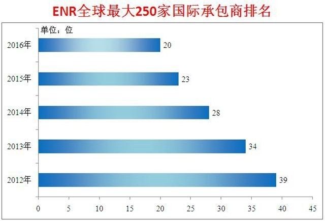 中国中铁在“ENR全球最大250家国际承包商”的排名情况为:2012年第39位,2013年第34位,2014年第28位,2015年第23位,2016年第20位。